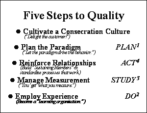 1. Cultivate a Consecration Culture (Create the Environment for Service Quality). Joel A. Barker says that the quality paradigm is essential to excel in the 1990's, but by the turn of the century will be a necessary condition for even being in business.(18) This is a natural consequence of firm after firm turning its focus to "delighting the customer." This value sharing paradigm is the only paradigm which has the power to build and sustain long-term relationships with customers so that they become "sustaining members" of the organization. As more and more firms adopt the value sharing paradigm, firms which are content with mere "customer satisfaction" will find their support base deteriorating as customers move their loyalty to firms whose total focus is toward not just satisfying, but delighting, their external and internal customers.