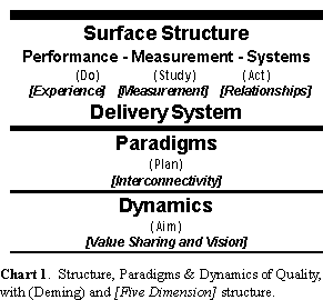 2. This structure is based on a five dimension quality structure of experience, measurement, relationships and systems, interconnectivity and paradigm logic, and value sharing. See Winder, Richard E., "Fulfilling Quality's Five Dimensions," 47th Annual Quality Congress Transactions, May 24- 26, 1993.