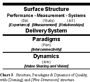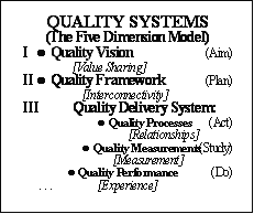The complete quality system, then, integrates five distinct dimensions of quality which underlie the Aim-Plan-Do-Study-Act cycle. The five dimensions of quality are 1) experience (do), 2) measurement (study), 3) relationships and systems (act), 4) interconnectivity and paradigm logic (plan) and 5) value sharing and vision (aim). The quality system begins with quality vision (aim) based on value sharing, and it brings this vision into actualization through a delivery system consisting of quality performance (experience), quality measurement, and quality systems, all in the context of a nurtured quality paradigm or framework.