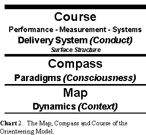 It is unfortunate that our language is linear and permits us to describe only one thing at a time. This may create a misperception that the orienteering model is composed of three different static parts--the map, the compass, and the course. However, the value of the orienteering model is not just in reading the maps of our environment or taking a compass reading to see which direction we are going or in having a course we can follow, with control points.